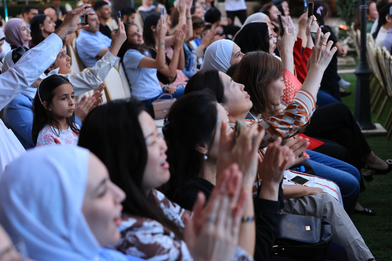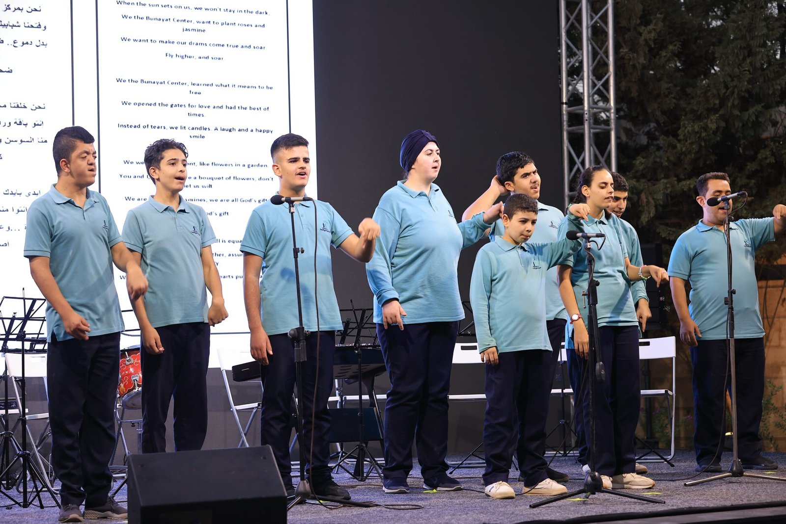 في بادرة إنسانية لاقت تفاعلًا كبيرًا، دعا المنظمون طلابًا أردنيين من ذوي متلازمة داون والتوحّد من مركز البنيات للتربية الخاصة للمشاركة في الغناء الجماعي. وقد أثرت أصواتهم الصافية في الحاضرين، مجسّدة روح “الوئام ووحدة البشرية”.