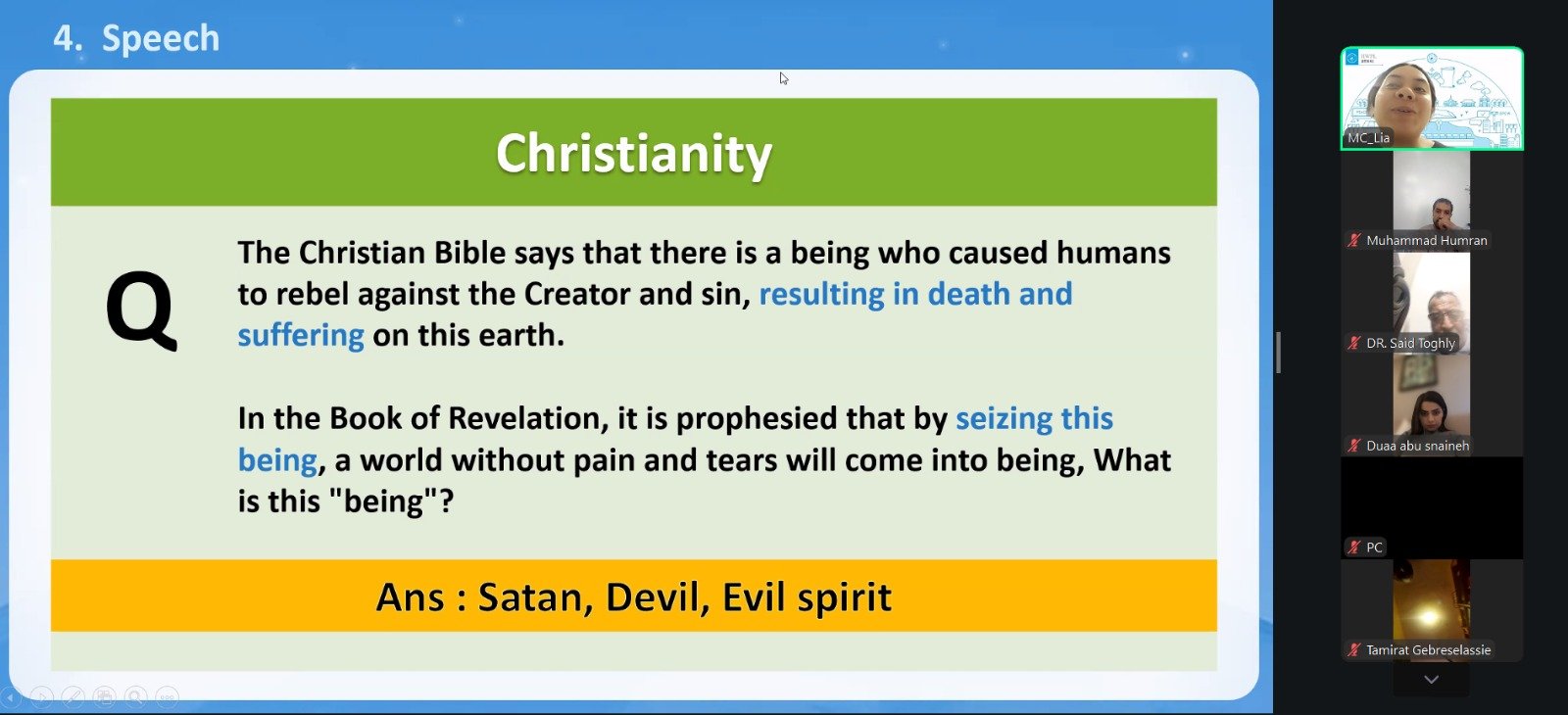تضمن البرنامج عروضًا قدمها ممثلون عن المسيحية والإسلام والهندوسية حول موضوع الولادة والشيخوخة والمرض والموت، تلتها مناقشات لمقارنة المواضيع المشتركة بين الأديان. ودرس المشاركون تفسيرات الحياة والموت من منظور ديني، واستعرضوا مبادئ التعايش الواردة في الكتب الدينية.